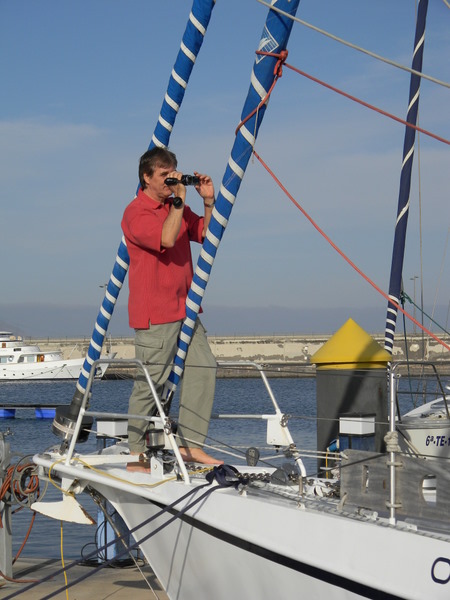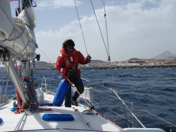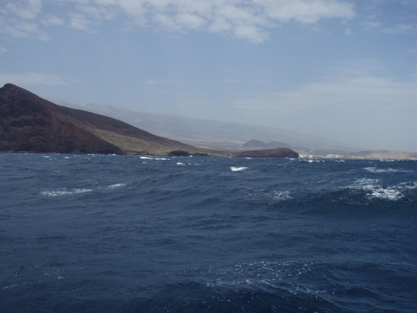 Schließlich versprechen die Vorhersagen für die immerhin 36 Seemeilen (8 Stunden segeln, wenn´s gut läuft) 12-14 Knoten, also angenehmen Segelwind. Natürlich hat sich Rasmus wieder etwas Feines für uns ausgedacht: zuerst ist zuwenig Wind, wir haben die Genua gesetzt und dazu den Jockel laufen, um einen Schnitt von 5 Knoten zu halten. Doch nach ein paar übellaunigen Wünschen kommt Wind – und mehr Wind – und noch mehr Wind – mit fast Sturmstärke (33 Knoten) kommen wir nach nur 7 Stunden in der Marina San Miguel an. Das Hafenmanöver ist dann bei so starkem Wind auch nicht ganz einfach. Doch schließlich sind wir fest und bedanken uns bei unserem französischen Nachbarn, der froh ist, dass wir seine Nussschale nicht versenkt haben!