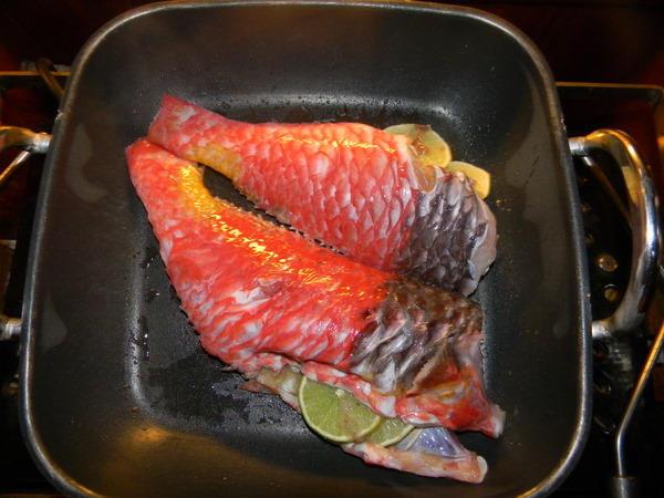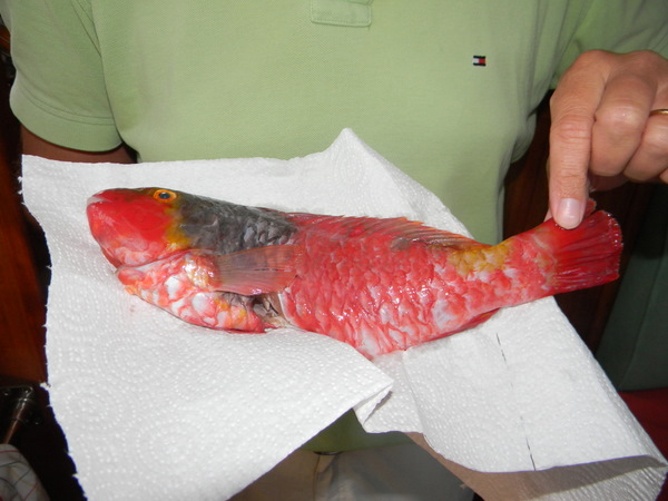 An unserem Steg gibt es einen Fischer, der fast jeden Tag mit seinem kleinen Schlauchboot hinausfährt, um mit der Harpune gezielt köstliche Fische zu jagen. Weil ich ihm einmal beim Anlegen helfe, schenkt er uns kurz darauf 2 wunderschöne Papageienfische. Sie leuchten rot und gelb und sind eigentlich zu schön für die Pfanne – aber sie schmecken dennoch köstlich!