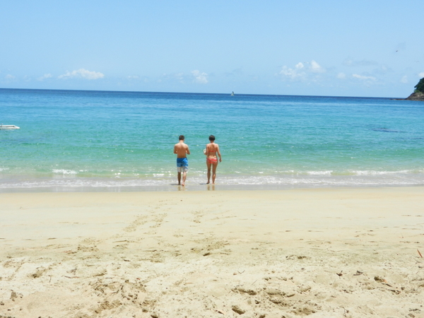 Erstes Ziel in der Karibik war die wunderschöne Insel Tobago. Das erste, was ich aus den rund ovalen Flugzeugfenstern einen kurzen Augenblick vor dem Aufsetzen der Flugzeugrollen sah, waren Palmen! Die Bekanntmachung mit dem typisch subtropischen Klima folgte beim Verlassen des Flugzeugs, da Tobago einen sehr kleinen ursprünglichen Flughafen besitzt und man deshalb das Flugzeug über eine Treppe und das Rollfeld verlassen musste. Auf Tobago gab es viele sehr schöne Buchten mit Bilderbuchstränden zu entdecken, unter anderem die Piratesbay ganz im Norden der Insel oder die Englishmansbay auf der dem karibischen Meer zugewandten Seite, also im Westen der Insel. Tobago besitzt einen sehr artenreichen Regenwald und eine große Anzahl an Wasserfällen, wir selbst besuchten den Argyle-Waterfall und natürlich auch den Regenwald. Ein sehr bekanntes Fotomotiv ist der Pigeonpoint im Süden Tobagos. Dieser stand am letzten Tag auf Tobago im Programm. Insgesamt verbrachten wir vier Nächte in einem kleinen Hotel in Crown Point, dem vom Tourismus erschlosseneren Teil der Insel. Unser Hotelier Andrew war hilfsbereit und gab uns stets sehr gute Tipps. Sein Verhalten war sehr karibisch, denn die meisten Leute auf Tobago, wie auch auf Grenada, sind sehr freundlich, hilfsbereit und gut gelaunt.