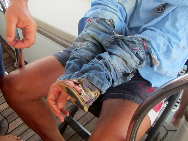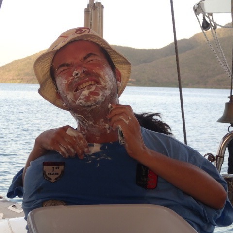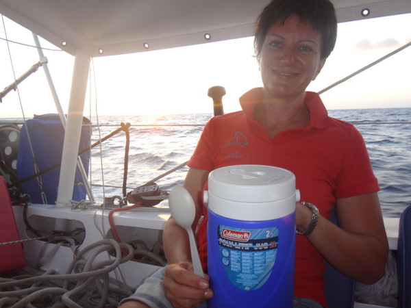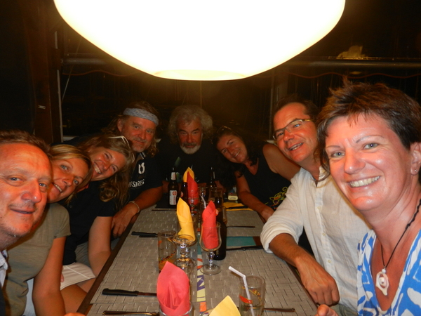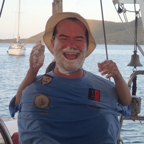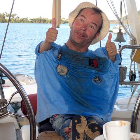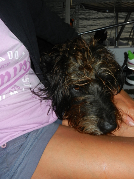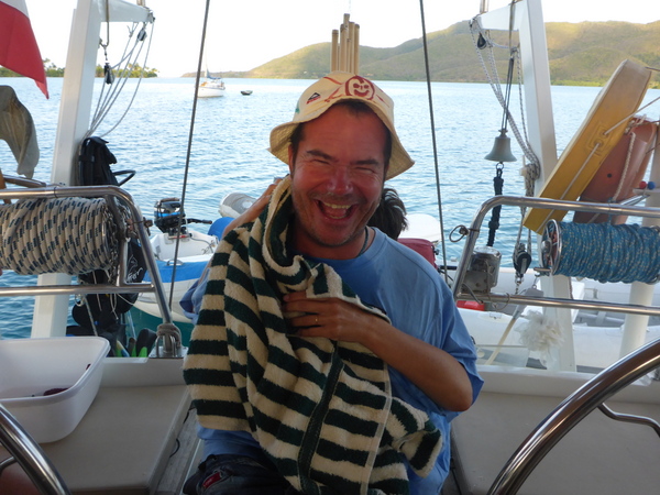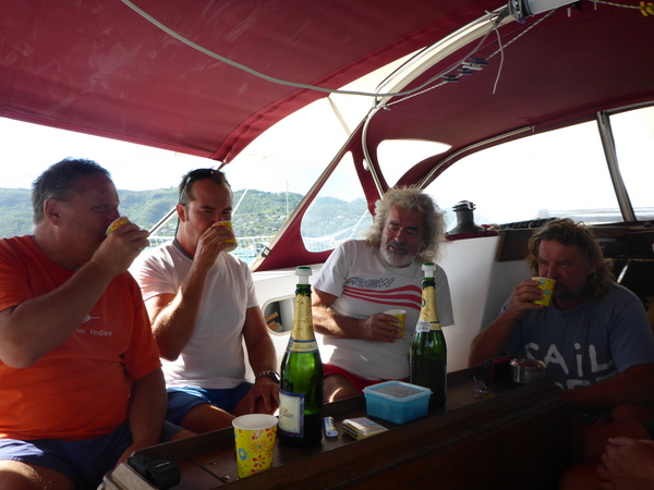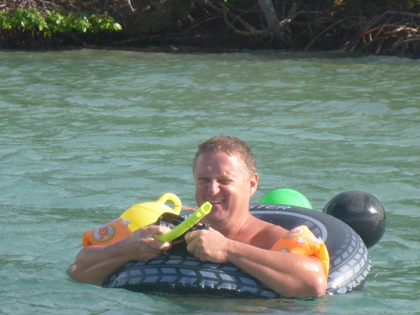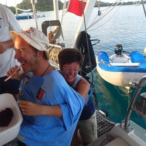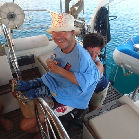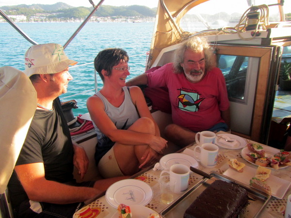 Dietmars 50. Geburtstag schreit nachträglich nach einer Würdigung. Dazu versenken wir eine 5 Liter-Pulle Rum an einem Anker. Die muss er sich, angetan mit Schwimmflügel und Badereifen, aber erst hochholen. Ein paar Tage später bin ich dran. Um 6 Uhr früh bumpern die Leichtmatrosen ans Schiff und machen ein Höllenspektakel. Uns reisst es aus den Betten und das Schicksal nimmt seinen Lauf….