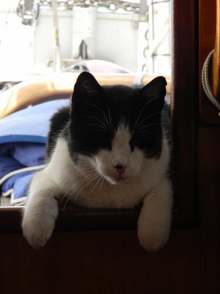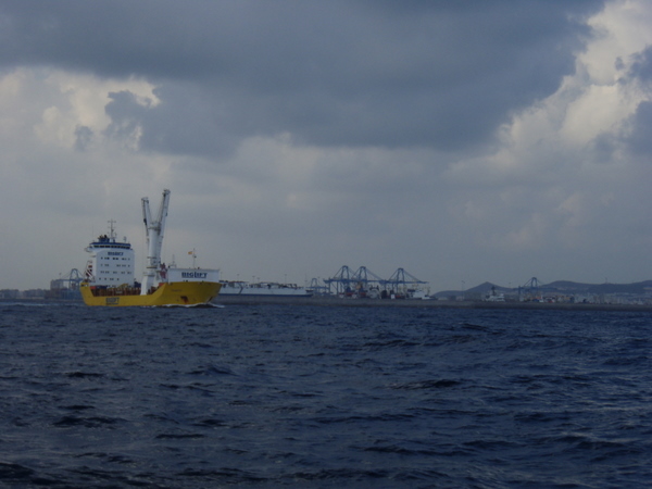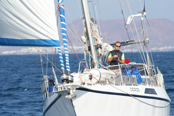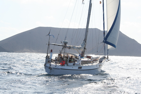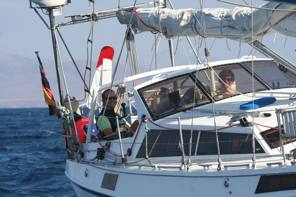 Am 28. Dezember dann war es soweit: Alle verfügbaren Wetterdienste sagten beste Bedingungen voraus. Abends um 9.00 h ging es dann los, wir wollten bis zum Morgengrauen die Küste Fuerteventuras hinter uns lassen und dann bis zum frühen Nachmittag in Las Palmas sein. Pustekuchen! Nachts war so gut wie gar kein Wind – was in unserem Fall ziemlich nervig war, da wir mit unserer provisorischen Schraube den Motor nur für die Hafenmanöver benutzen wollten. Dafür briste es ziemlich auf, als wir Fuerteventura endlich hinter uns lassen konnten und mit viel zu starkem Wind nach Gran Canaria brausten. Die Wellen waren recht konfus – da wurde sogar mein Käpt´n seekrank und das will schon was heißen! Ich hatte zum Glück zuvor meine Pillen genommen, so dass ich diesmal wirklich seefest war. Kurz vor Sonnenuntergang kamen wir dann in Las Palmas an – zur Begrüßung standen Lisa und Sven schon da.