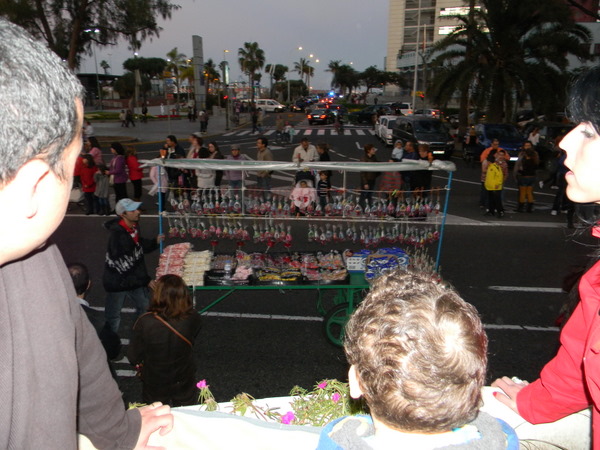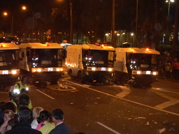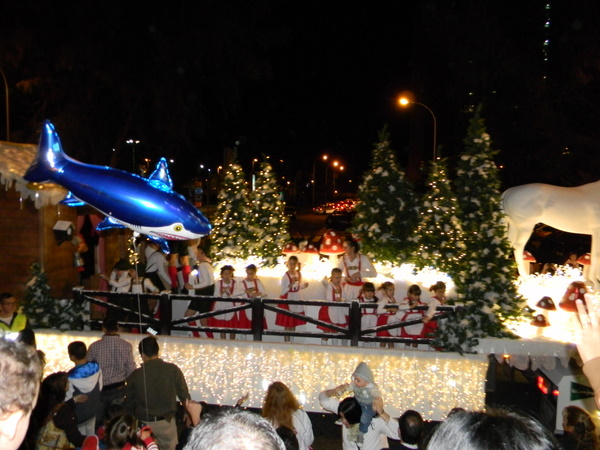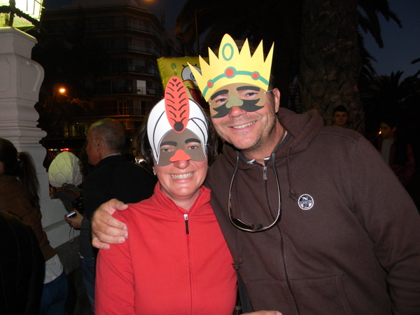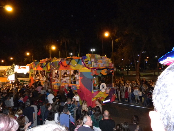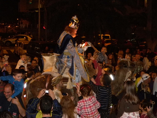 In Spanien werden die Geschenke nicht wie bei uns an Weihnachten verteilt, sondern an Heilig Drei König. Daher ist das ein ganz wichtiger Tag und wird hier auch ganz besonders gefeiert: Am Vorabend gibt es einen großen Umzug, bei dem die Heiligen Drei Könige auf ihren Kamelen durch die Stadt reiten. Das Ganze sieht dann aus wie bei uns die großen Faschingsumzüge, bei denen bunte und vor allem laute Wägen durch die Straßen fahren und viele viele Bonbons verteilt werden. Im hinteren, ruhigeren Teil des Umzugs folgen dann die Könige – die armen Kamele haben das alles mit einer großen Gelassenheit hingenommen.
