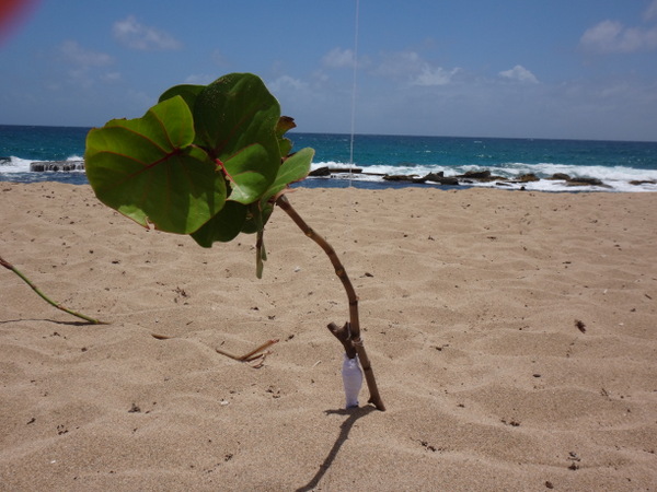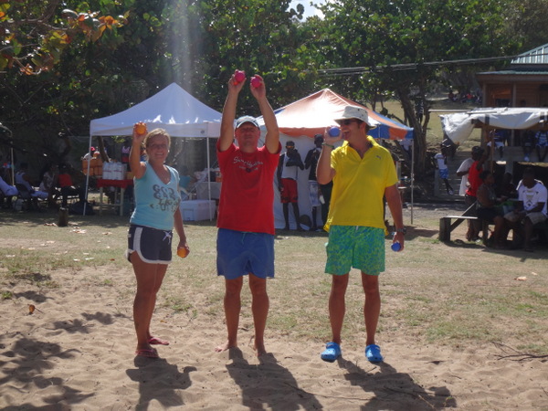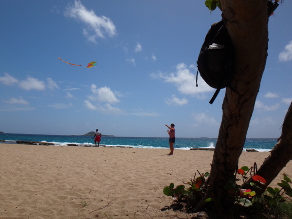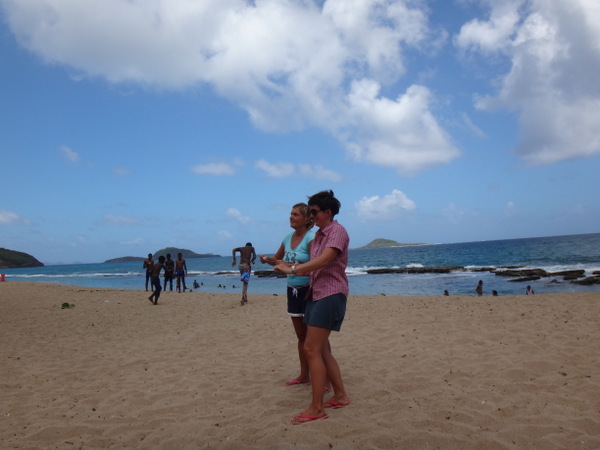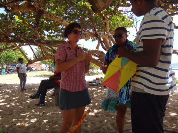 Beim Versuch, meinen Drachen steigen zu lassen, scheitere ich erstmal. Er steigt zwar schnell hoch hinauf, aber genauso schnell will er wieder runter. Da hilft auch das Ziehen an der Drachenschnur nichts. Leider bildet sich mein Drachen ein, dass es auf dem Baum am schönsten ist und sucht sich dort ein Plätzchen aus. Florian organisiert einen langen Stock und endlich haben wir den Widerspenstigen wieder am Boden. Aber oh Schreck – er hat ein paar Schrammen abbekommen, die sich in Form von Rissen in der Bespannung bemerkbar machen. Sofort kommt der einheimische „Kitedoctor“ mit Klebeband und dem nächsten Versuch steht nichts mehr im Weg. Florian verlängert das Band, in das Michael noch ein Stöckchen hineinbindet, damit der Drachen schwerer wird. Und siehe da: er fliegt wie eine Eins! Ein kleines Bäumchen am Strand dient als Drachenbändiger und so fliegt mein Drachen in den Nationalfarben Grenadas für den Rest des Tages fröhlich mit den anderen Drachen am Himmel. Insgesamt sind es nicht so viele wie gedacht, aber knapp 50 Drachen am Himmel ist auch ein schönes Bild. Wir sind fast die einzigen „Bleichgesichter“, hierher verirren sich nur wenige Touristen.