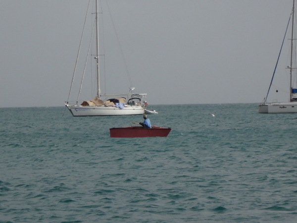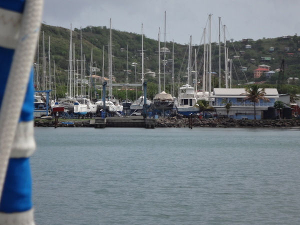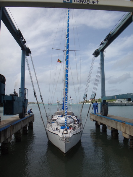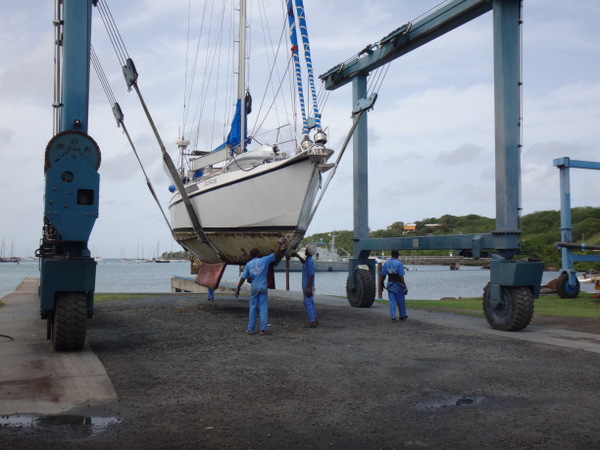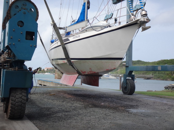 In ein paar Tagen steht wieder ein Landeswechsel an. Nein, nicht mit unserem Schiff, sondern mit dem Flieger. Die Hurrikansaison 2015 wollen wir diesmal zum größten Teil in Deutschland verbringen. Die Vorbereitungen laufen auf Hochtouren: Unsere OOROS steht zwischenzeitlich an Land und sieht irgendwie ganz traurig aus. Die Segel haben wir abgeschlagen und im Schiffsinneren verstaut. Komischer Anblick. Allerdings sieht man die Flamingobeine noch! Zur Erinnerung: Ich habe auf Teneriffa die Reste vom roten und weißen Antifouling gemischt und damit unsere Twinkiele gestrichen. Wir sind das einzige Schiff mit rosaroten Beinen in der inzwischen vollen Werft.