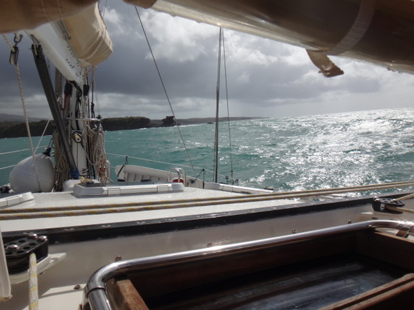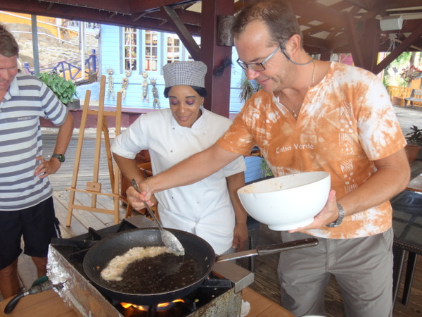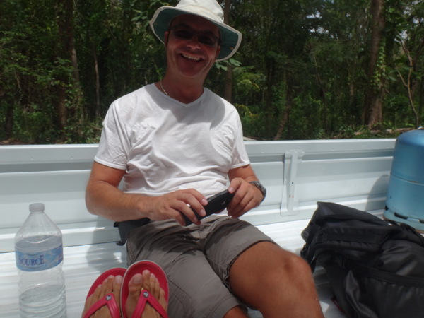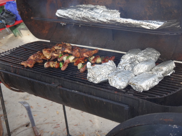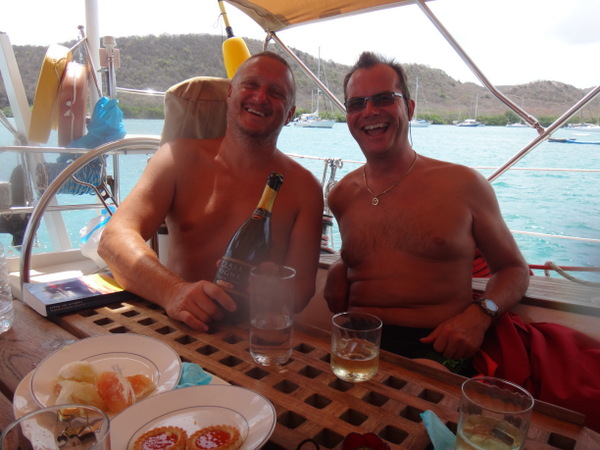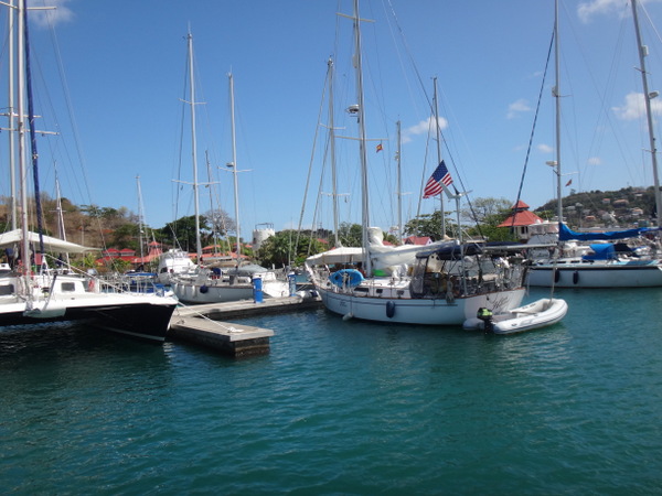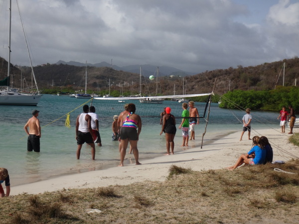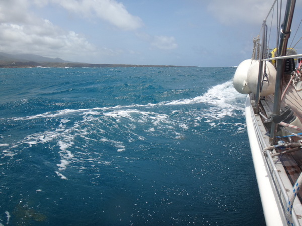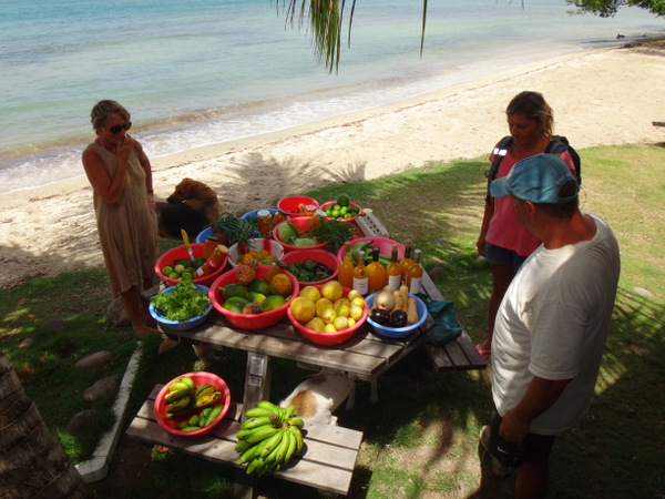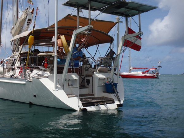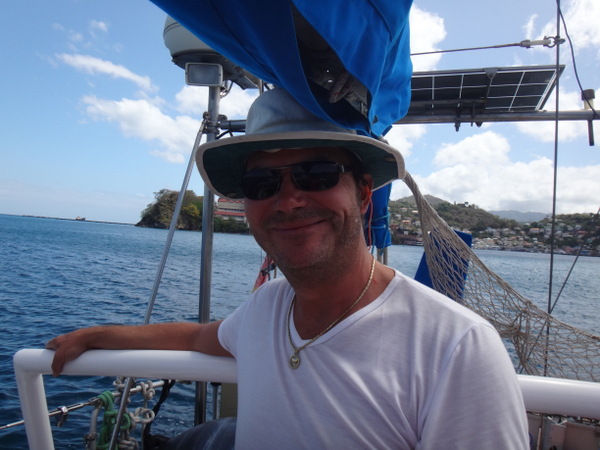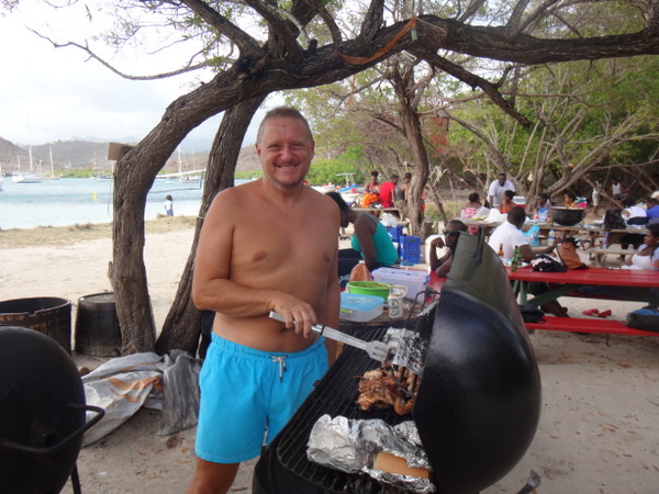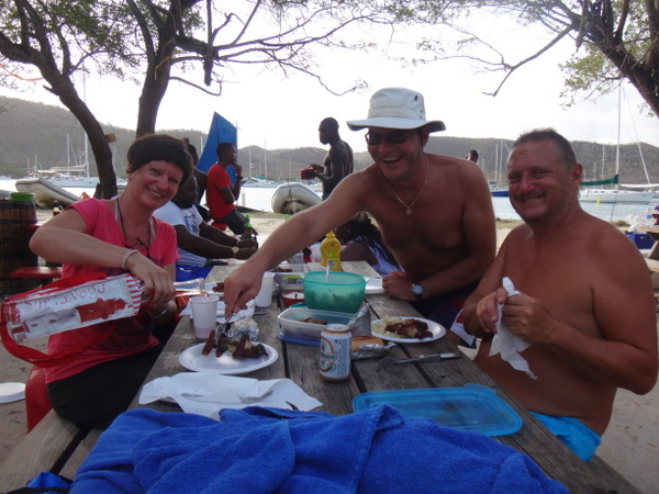 Dietmar und Martina laden uns ein, mit ihnen einen kleinen Segelausflug nach Hog Island zu machen. Diese kleine Insel ist über eine Fußgängerbrücke mit dem Festland verbunden. Nur eine improvisierte Strandbar und eine ebensolche Bühne für gelegentliche sonntägliche Events gibt es hier. Wir verbringen dort einen feuchtfröhlichen Grillabend. Am nächsten Tag hat der Kater seine Krallen gewetzt. Gegen Wind und Welle mit nur einer Banane gegen den Restalkohol wird es eine ungemütliche Fahrt. Flau im Magen steuern wir der letzten ankerbaren Bucht im Süden Grenadas entgegen. Dort bereitet uns Martina ein opulentes Frühstück. Solcherart gestärkt wollen wir die Rückreise zu unserer Marina mit dem Bus antreten. Aber wir haben Glück: kaum an Land, werden wir auf der Ladefläche eines kleinen Pickup bis in unsere Marina gefahren. Die frische Luft, die in Orkanstärke um den Kopf bläst, tut uns gut.