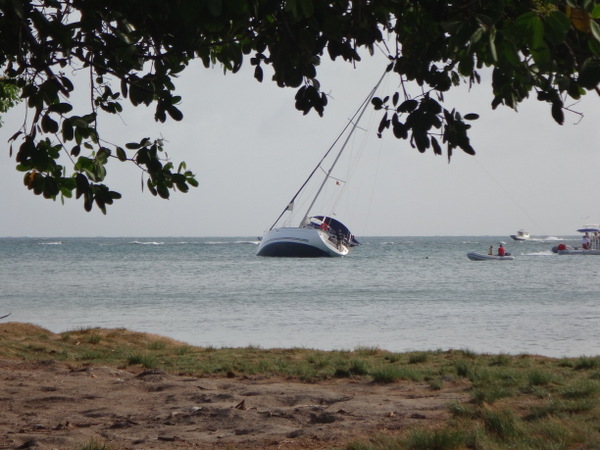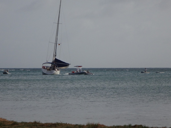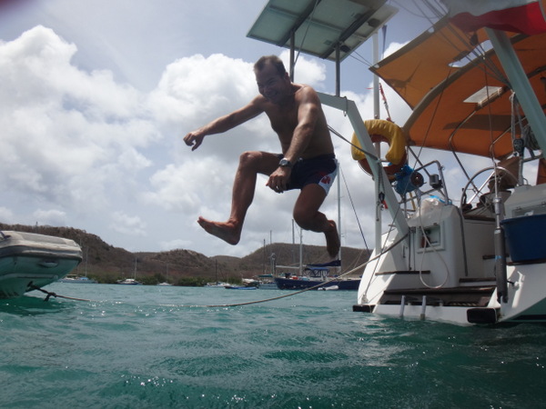 Vor ein paar Tagen haben wir unser Schiff endlich wieder selbst bewegt! Wir werden mit Küsschen verabschiedet und aufgefordert, wiederzukommen. Doch zunächst wollen wir einfach nur weg und segeln entspannt so nah an der Küste wie es gefahrlos möglich ist. Ein Strand am anderen, nur unterbrochen von Felsformationen, zieht sich bis Point Salinas. Es ist der südwestlichste Punkt der Insel und gleichzeitig der Beginn der Landebahn des internationalen Flughafens von Grenada. Und tatsächlich schwebt vor uns eine kleine Maschine der DHL ein. Offensichtlich wird hier nicht gestreikt. Unser Ziel ist die traumhaft schöne Prickly Bay. Sie ist großzügig, umsäumt von Hügeln und Palmen bestandenen Stränden. Endlich wieder vom Schiff aus ins Wasser springen – einfach herrlich!