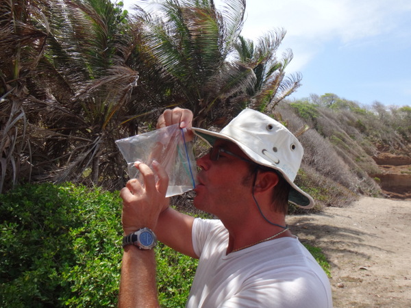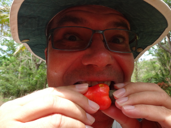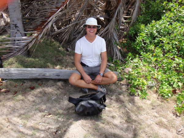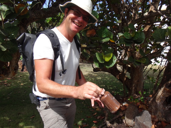 Mit Dietmar und Martina wandern wir auf der Halbinsel Westerhall Point. Hier reiht sich ein herrliches Anwesen an das nächste. Die Eigentümer haben sich verpflichtet, auf Zäune zu verzichten, entsprechend gleicht die Landschaft einem gepflegten Park. Hier haben wir zusammen unseren ersten Geo-Cache auf Grenada gefunden. Für alle, die es nicht wissen: Geo-Cache ist eine Art Schnitzeljagd, dabei sind an bestimmten Stellen verschieden große Behälter versteckt, in denen außer Papier und Stift sich kleine Dinge befinden, siehe hierzu die Fotos. Die Beschreibung des Caches kann man im Internet finden. Sie gleicht allerdings einem Rätsel.