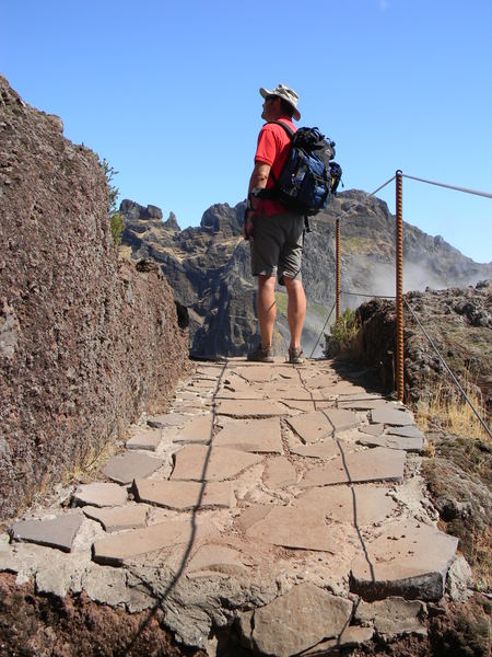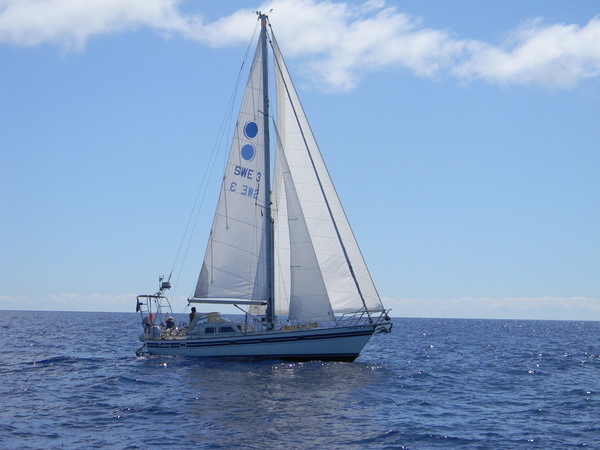 Bei Kaiserwetter fahren wir dann die 6-7 Stunden nach Madeira und brachten zum 1. Mal unsere Schleppangel aus. Hier soll man sehr gute Chancen auf einen Fang haben, aber trotz des tollen Gummitintenfisches, den wir an einer 100 Meter-Leine hinter uns herzogen, wollte kein Fisch beißen. Schon weit vor der Marina, in der Nähe von Caniçal, schoss uns der Marinero mit seinem Gummiboot entgegen, um uns einen Platz in der halbleeren Marina zuzuweisen. Schon vorher hatten wir mit Sven und Lisa, unseren schwedischen Freunden von der Randivåg, ausgemacht, uns einen Leihwagen für 8 Tage zu teilen. Schnell hatte Sven seine Wunschliste mit allem, was er auf Madeira sehen wollte, bereit. Von meinen bisherigen Aufenthalten auf Madeira kenne ich selber einige schöne Flecken, die ich gerne wieder sehen wollte. Highlight ist die Wanderung von Madeira´s zweithöchsten Berg auf den höchsten Gipfel, den Pico Ruivo. Während dieser 7-stündigen Wanderung hatten wir alle zu kämpfen. Sie führt über schmale Grade durch mehrere Tunnels und an der senkrechten Wand entlang. Da hätten die Damen doch beinahe gestreikt und tatsächlich 25 Minuten vor dem Pico Ruivo-Berghaus aufgegeben. Doch mit der Ansage, dass hinter der nächsten Biegung 😉 schon der Rastplatz ist, konnten wir die unerschrockenen Seglerinnen dann noch einmal motivieren. Und so erreichten wir glücklich das Ziel. Bizarrer und wilder können wir´s uns gar nicht vorstellen. Wir unternehmen viel und verstehen uns prächtig. Für uns ist es ein Geschenk. Dann feiern wir auch noch Lisa´s Geburtstag mit einem feinen Essen und deftigem schwedischen Schokokuchen zum Dessert.