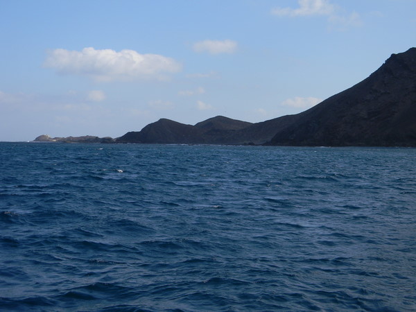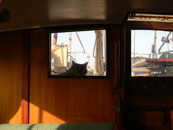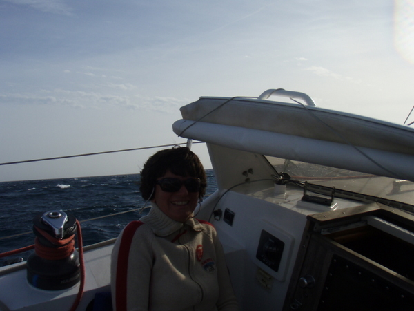 Der Wind nimmt ziemlich zu, die Wellen auch und so sitzen wir dick verpackt im Cockpit, müssen immer wieder einen Schwall Wasser über uns ergehen lassen, der entweder vom Vorschiff oder direkt von der Seite über uns herfällt. Die Gischt spritzt hoch bis ins Segel und überzieht das ganze Schiff mit einer Salzkruste. So hatten wir uns das eigentlich nicht gedacht, aber wir nehmen´s gelassen und machen das Beste daraus.