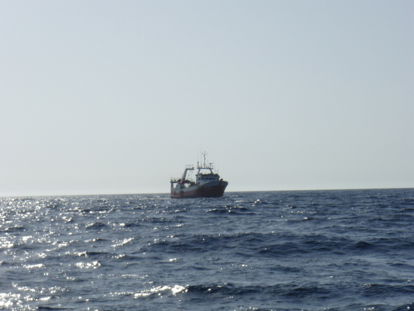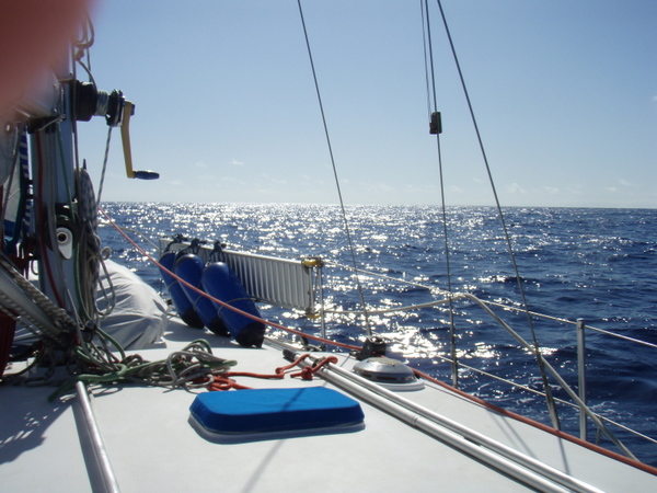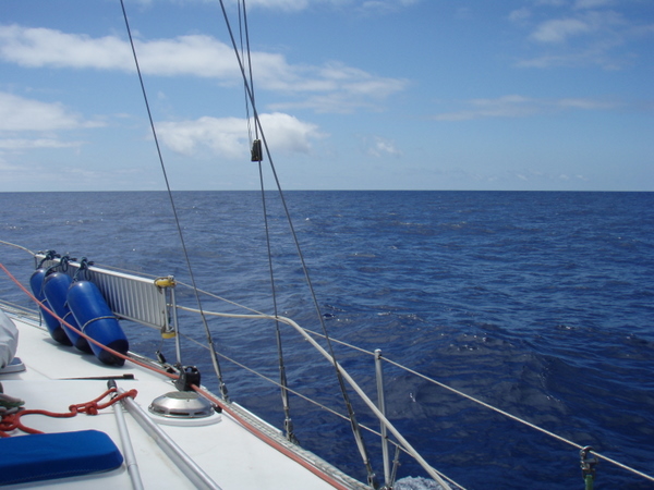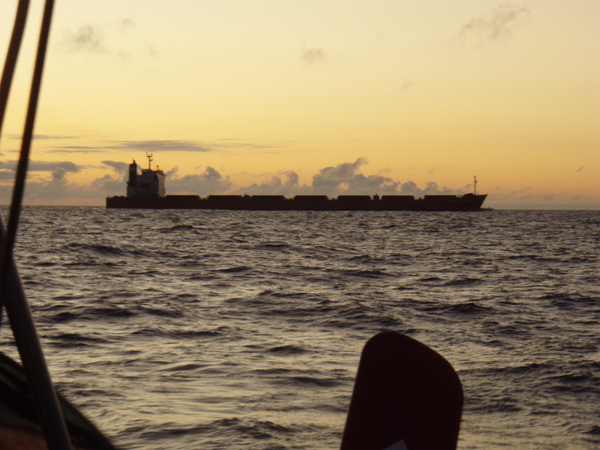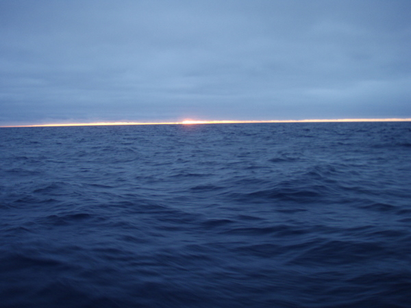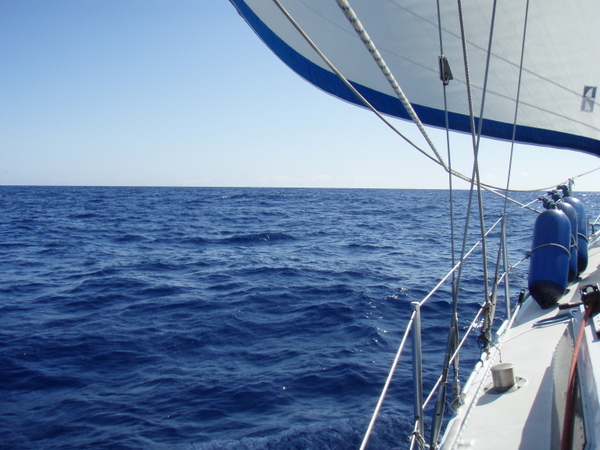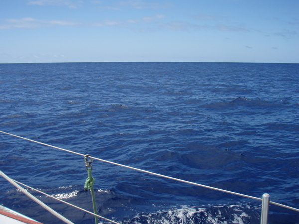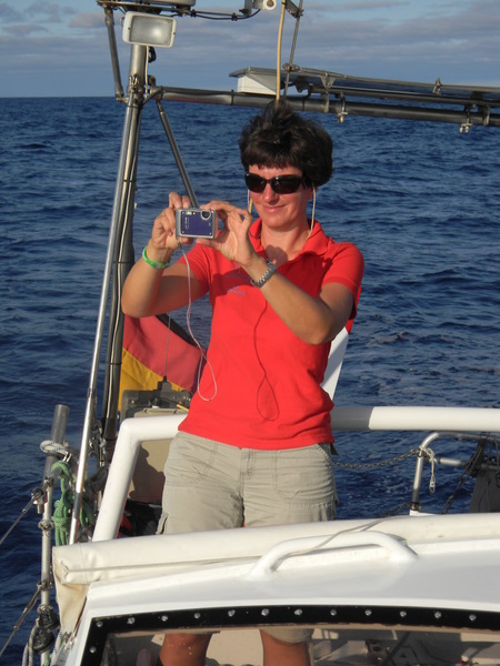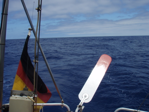 Am nächsten Tag beruhigt sich das Wetter wieder und es ist so, wie wir uns die Überfahrt gewünscht haben. Optimaler Wind, ruhige See, ab und zu ein großes Schiff, das meist in großem Abstand an uns vorbeifährt. Ich habe das Gefühl, wir treiben auf einem riesigen, randvollen Suppenteller. Wohin ich auch schaue, überall Wasser und die Illusion einer riesigen Platte. Die Erde ist eine Scheibe? – keine Frage! Und egal, in welche Richtung oder in welcher Geschwindigkeit wir uns fortbewegen, wir bleiben immer in der Mitte.