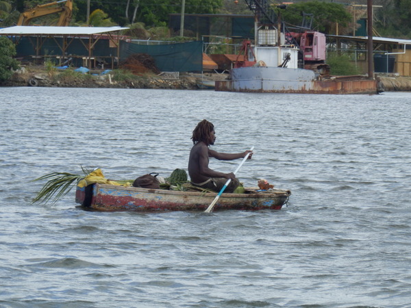 Also ausklarieren, Leinen von der Muringboje lösen und los. Der Übernachtungsstopp vor Anker bei den Pitons gehört für uns zum „Pflichtprogramm“. Am nächsten Tag um kurz vor 6 in der Früh geht’s los zur nächsten Insel St. Vincent, wo wir in Chateaubelair (wie dieser hochtrabende Name zu dem winzigen Ort passen soll – keine Ahnung) einklarieren wollen. Gleich nachdem der Anker gefallen ist, ziehe ich mich um – man soll ja immer ordentlich gekleidet zu den Behörden gehen – und wir steigen ins Dinghi, um damit an Land zu fahren. Wellen brechen sich am Strand, uns ist etwas mulmig, aber was hilft´s. Also mit Schwung das letzte Stück Richtung Land, Motor vorher hochstellen, damit die Schraube nicht im flachen Sand hängenbleibt und dann – tja dann läuft alles anders als geplant: Was wir vorher nur aus Erzählungen von anderen Seglern kennen, wird nun bei uns Realität, das Dinghi wird von einer Welle hochgehoben, die sich am steilen Strand bricht oder soll ich besser sagen über uns herbricht und dem Dinghi und damit auch uns zu einem spektakulären Purzelbaum verhilft. Wir sind soweit noch ganz heil und über den Strand kommen gleich Einheimische gelaufen, um uns zu helfen. Triefend nass und schockiert stehen wir da wie die begossenen Pudel. Meine Sonnenbrille hat sich verabschiedet und sich ohne Abschiedsgruß dem Meer angeschlossen. Zum Glück haben wir alle Unterlagen zum Einklarieren in unserem wasserdichten Rucksack, aber tropfnass bei den Behörden antanzen? Scheint mir unmöglich, aber wieder zurückfahren, umziehen und nochmal anlanden ist auch nicht sehr verlockend. Einer unserer Helfer meint, es handelt sich um einen Notfall, „emergency“, und es sei kein Problem, nass und mit schwarzem Sand beklebt beim Zoll vorstellig zu werden. Gesagt, getan. Ein netter Einheimischer begleitet mich zum Zoll – dorthin hätte ich unmöglich selbst gefunden, ich will schon umdrehen, weil es mir schon seltsam vorkommt, von einem fremden Mann in einen Hinterhof geführt zu werden. Aber tatsächlich sehe ich vom Hof aus das Schild „CUSTOMS“ am Geländer im 1. Stock hängen. Es ist hier alles etwas unkomplizierter, die zuständige Dame muss sich erst was Anständiges anziehen, bevor ich die Außentreppe zu ihrem Büro darf. Dafür stört sie sich auch nicht an der schwarzen Sandpfütze, die ich in ihrem eher provisorischen Zollbüro hinterlasse. Erste Hürde geschafft. Jetzt noch zur Polizei, die für den Stempel im Pass zuständig ist. Auch hier sorge ich für den nassen Sandkleks, was mir aber vom netten Officer mit einem Lächeln verziehen wird.