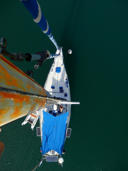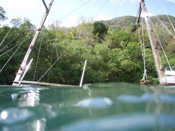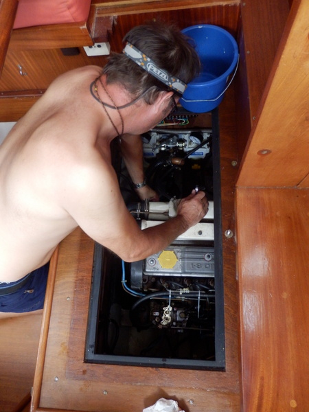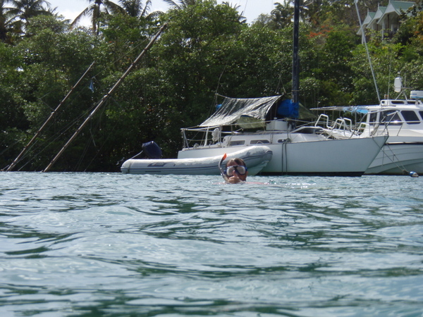 Immer noch leicht triefend mache ich mich auf den Weg zurück zum Strand. Dort stehen etwa 8 Einheimische um den Außenbordmotor rum, der aufgrund des Salzwassers nicht mehr anspringen will. Doch viele helfende Hände, ein Eimer voll Frischwasser und Einer, der Ahnung hat, bringen den Motor wieder zum Schnurren. Beim nächsten Mal weiß Florian, wie´s geht – auch wenn wir das hoffentlich nicht nochmal brauchen! Jetzt nichts wie zurück auf´s Schiff, eine Runde schwimmen, um die Anspannung loszuwerden, und dann eine schöne Frischwasserdusche. Die verkneifen wir uns sonst und ledern uns nur ab, um Wasser zu sparen, aber heute ist ein echter Sonderfall.