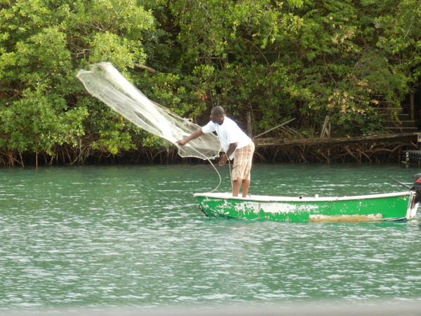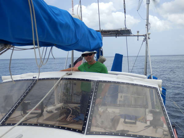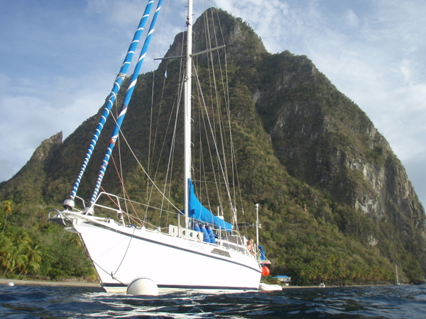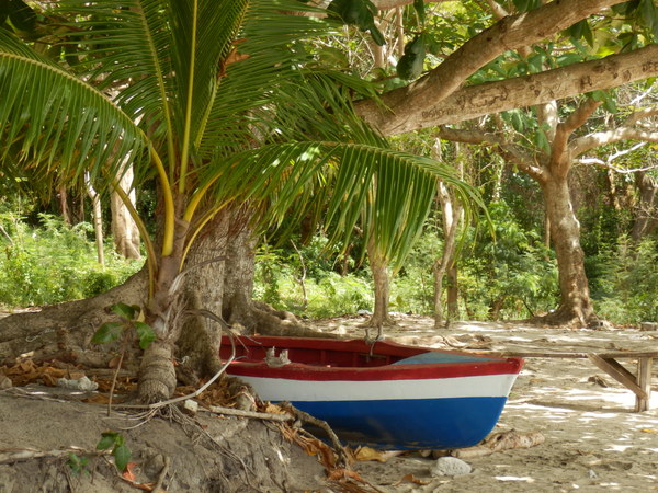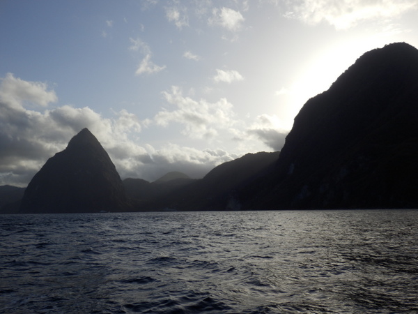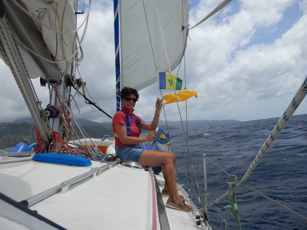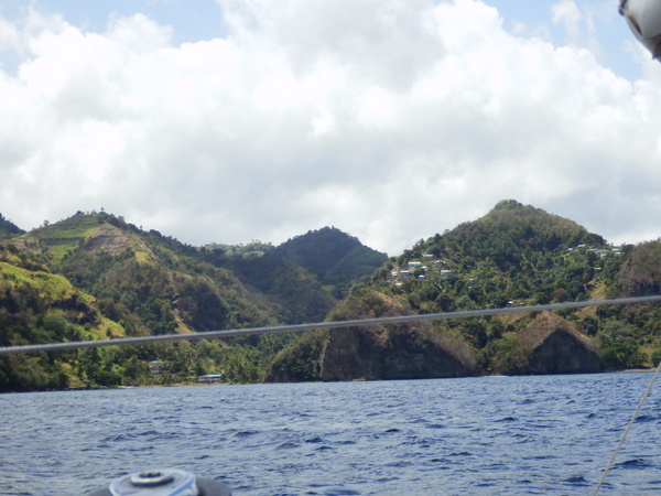 Also ausklarieren, Leinen von der Muringboje lösen und los. Der Übernachtungsstopp vor Anker bei den Pitons gehört für uns zum „Pflichtprogramm“. Am nächsten Tag um kurz vor 6 in der Früh geht’s los zur nächsten Insel St. Vincent, wo wir in Chateaubelair (wie dieser hochtrabende Name zu dem winzigen Ort passen soll – keine Ahnung) einklarieren wollen. Gleich nachdem der Anker gefallen ist, ziehe ich mich um – man soll ja immer ordentlich gekleidet zu den Behörden gehen – und wir steigen ins Dinghi, um damit an Land zu fahren. Wellen brechen sich am Strand, uns ist etwas mulmig, aber was hilft´s. Also mit Schwung das letzte Stück Richtung Land, Motor vorher hochstellen, damit die Schraube nicht im flachen Sand hängenbleibt und dann – tja dann läuft alles anders als geplant: Was wir vorher nur aus Erzählungen von anderen Seglern kennen, wird nun bei uns Realität, das Dinghi wird von einer Welle hochgehoben, die sich am steilen Strand bricht oder soll ich besser sagen über uns herbricht und dem Dinghi und damit auch uns zu einem spektakulären Purzelbaum verhilft. Wir sind soweit noch ganz heil und über den Strand kommen gleich Einheimische gelaufen, um uns zu helfen. Triefend nass und schockiert stehen wir da wie die begossenen Pudel. Meine Sonnenbrille hat sich verabschiedet und sich ohne Abschiedsgruß dem Meer angeschlossen. Zum Glück haben wir alle Unterlagen zum Einklarieren in unserem wasserdichten Rucksack, aber tropfnass bei den Behörden antanzen? Scheint mir unmöglich, aber wieder zurückfahren, umziehen und nochmal anlanden ist auch nicht sehr verlockend. Einer unserer Helfer meint, es handelt sich um einen Notfall, „emergency“, und es sei kein Problem, nass und mit schwarzem Sand beklebt beim Zoll vorstellig zu werden. Gesagt, getan. Ein netter Einheimischer begleitet mich zum Zoll – dorthin hätte ich unmöglich selbst gefunden, ich will schon umdrehen, weil es mir schon seltsam vorkommt, von einem fremden Mann in einen Hinterhof geführt zu werden. Aber tatsächlich sehe ich vom Hof aus das Schild „CUSTOMS“ am Geländer im 1. Stock hängen. Es ist hier alles etwas unkomplizierter, die zuständige Dame muss sich erst was Anständiges anziehen, bevor ich die Außentreppe zu ihrem Büro darf. Dafür stört sie sich auch nicht an der schwarzen Sandpfütze, die ich in ihrem eher provisorischen Zollbüro hinterlasse. Erste Hürde geschafft. Jetzt noch zur Polizei, die für den Stempel im Pass zuständig ist. Auch hier sorge ich für den nassen Sandkleks, was mir aber vom netten Officer mit einem Lächeln verziehen wird.