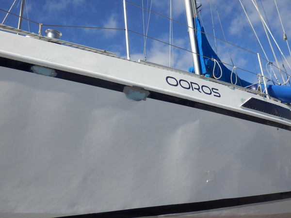 Als die OOROS aus dem Wasser gehoben wird, bekommen wir erstmal einen Schreck, denn von der weißen Farbe ist unter der Wasserlinie nichts mehr zu erkennen. Jede Menge Algen, Muscheln und Seepocken haben sich im Laufe der Zeit festgesetzt. Doch mit Spachtel und Dampfstrahler beseitigen die Männer in der Werft den gröbsten Schmutz. Der angeheuerte Maler schleift alles gründlich ab, bevor die erste Schicht Anutifouling in Knallrot auf’s Schiff kommt. Sieht schön aus, soll aber nur anzeigen, wenn die darüberliegenden weißen Schichten abgetragen sind. Als nächste Schicht kommt Weiß. Doch das deckt nicht wirklich gut und so hat unser Schiff plötzlich einen leicht rosaroten Schweinebauch! Ich bringe noch eine Schicht Weiß auf, jetzt ist alles wieder in Ordnung. Aber was soll ich mit der restlichen Farbe tun? Ein halber Liter Rot und ein halber Liter Weiß sind noch übrig. Meine Idee: zusammenmischen und dem Schiff Flamingobeine malen! Sieht wirklich nett aus, ist aber leider nicht mehr zu sehen, da die beiden Kiele ja weit unter der Wasserlinie liegen. Aber wir wissen es und freuen uns.