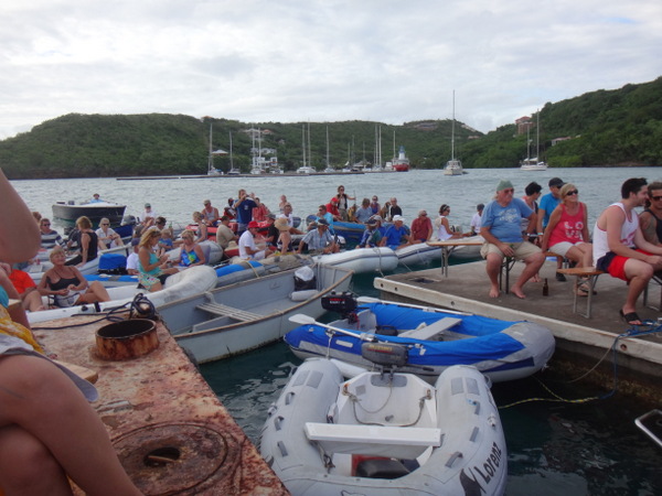 Vor einigen Tagen dann das Dinghi-Konzert. Ein Highlight, bei dem die Band auf einem alten Schlepper spielt, rechts und links sind Schwimmpontons für die Besucher, dahinter sind dann die Tenderboote der Yachten die in der Nähe liegen.